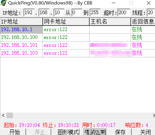 掃描速度快:選擇要 ping 的 IP 段後,直接點擊開始,速度令人驚嘆,幾秒後就能得到掃描結果。例如在掃描小型辦公室的區域網路 IP 段時,QuickPing 能在極短時間內完成掃描,大大節省了排除網路問題的時間。