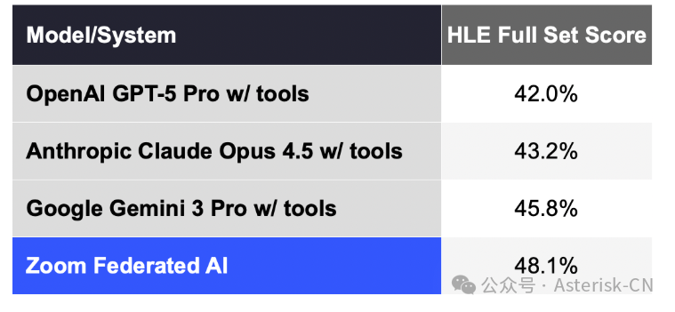 今天,我們宣布Zoom在具有挑戰性的”人類最後考試”(HLE)全套基準測試中取得了新的最先進(SOTA)成果,得分為48.1%,比之前谷歌Gemini3-pro工具集成的45.8%的SOTA結果提高了2.3%。
