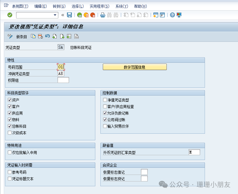 3)定義了允許記帳的科目類型。透過應用程式配置設置,我們可以將交易定義並限制為特定的憑證類型。憑證類型決定憑證的編號範圍:系統透過不同的憑證類型編號範圍儲存一種憑證類型的所有憑證。編號範圍可以是外部定義也可以是內部定義。