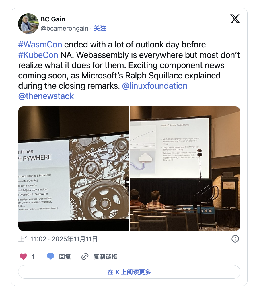 在CNCF主辦、與KubeCon+CloudnativeCon北美2025同期舉辦的WasmCon大會上,Cosmonic首席技術官Bailey Hayes致開幕詞,他闡述了WebAssembly強大的核心優勢:「近乎零冷啟動、高工作負載密度以及輕量級、可移植的運行時環境,即使在高效資源受限的環境下也能盛會盛會的。